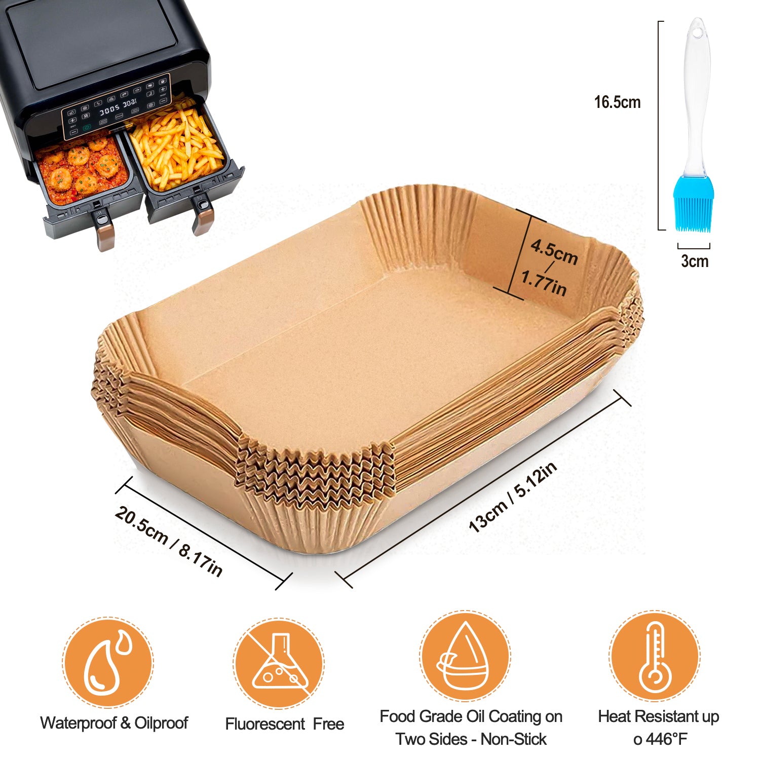 - Premium Quality Materials: Our air fryer liners are made from 100% food-grade pulp with a non-stick coating, offering non-stick, waterproof, oil-resistant, and excellent heat resistance properties. They are both healthy and environmentally friendly. Equipped with a silicone brush, they make it easy to apply seasonings. Perfect for cooking various foods while preserving their original flavors..